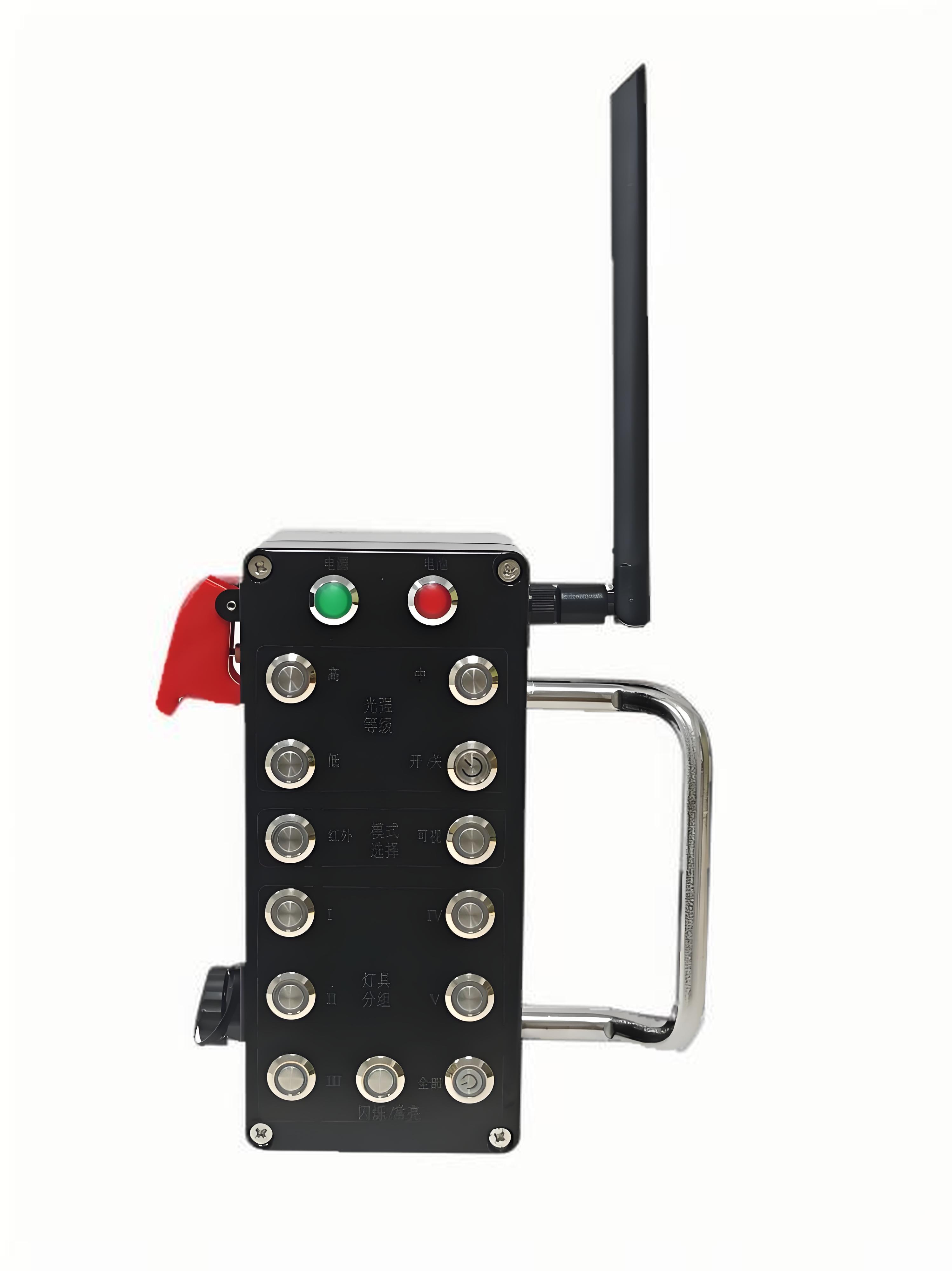 灯具可选无线遥控器,实现5公里范围内的远程遥控,可实现灯具分组、三级调光、闪烁/常亮切换、可见光/红外线切换等功能。